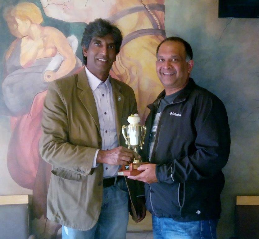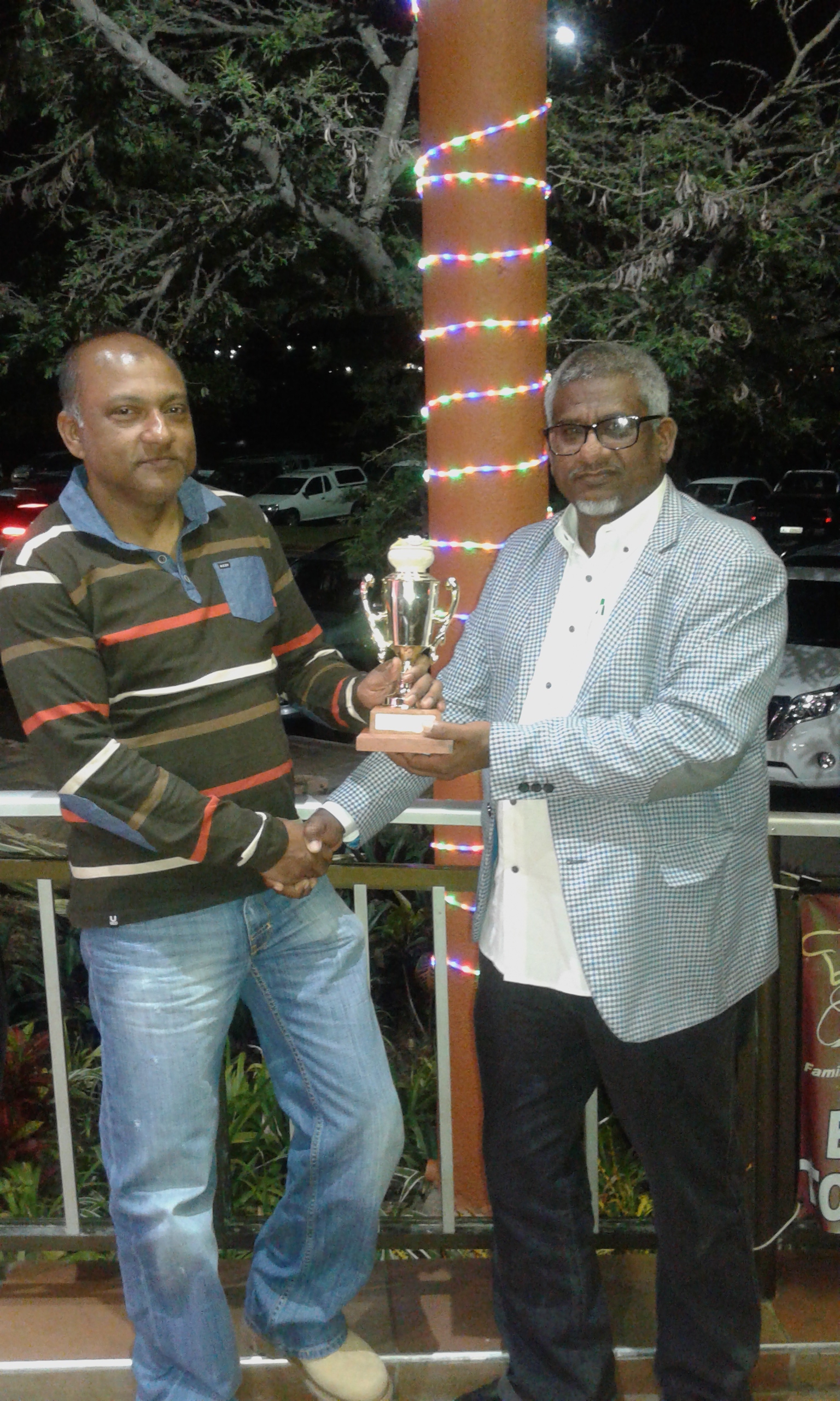 On the 19th August 2015, at the V&A Waterfront, Cape Town, South Africa, the trophy is passed on to Pandaram [Bobby] Moonsamy, left, from Naidoo Sagaran, right.