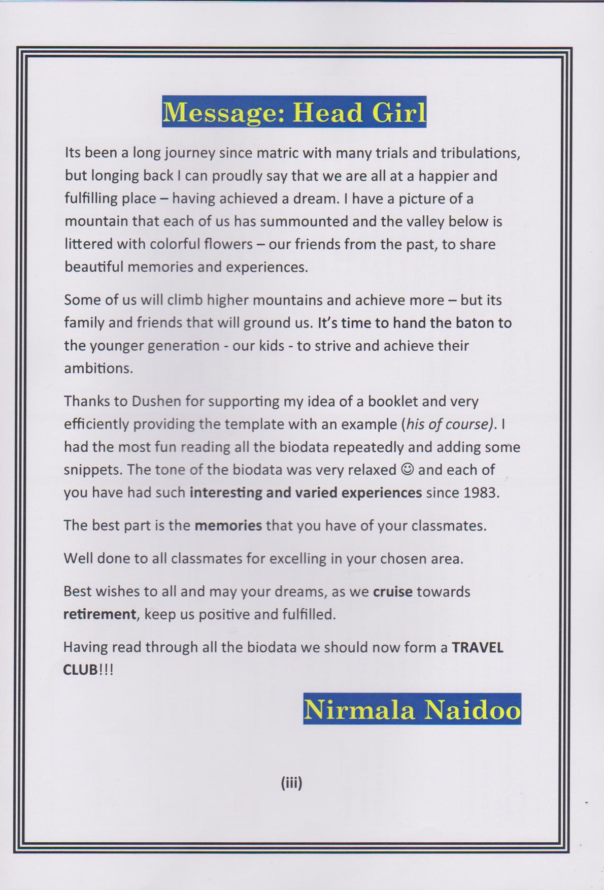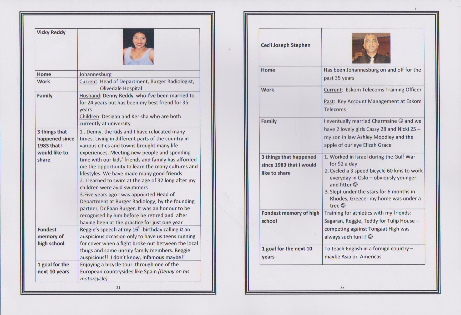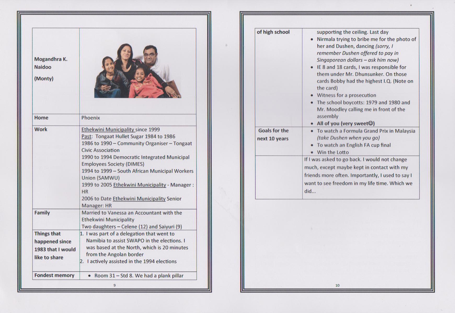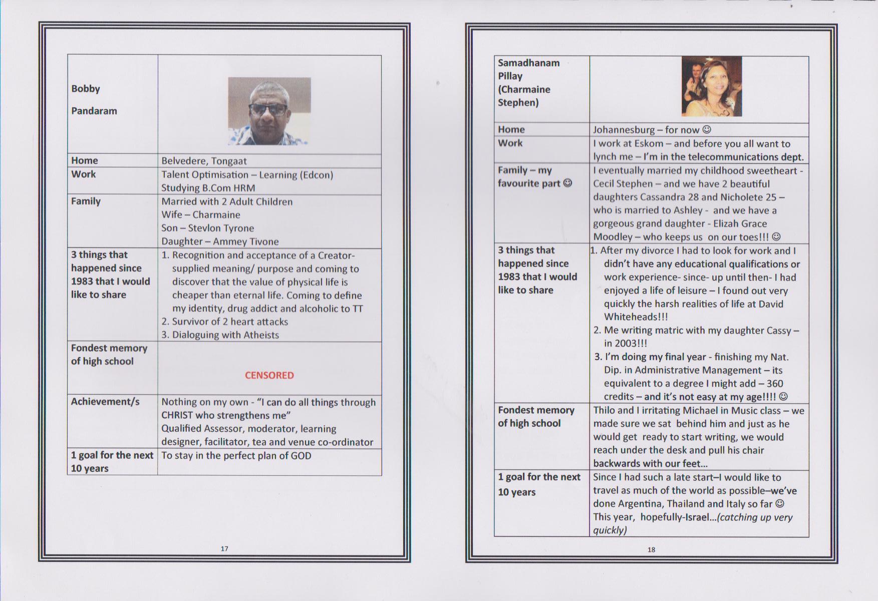 Dushendra J Chetty, the first presentation takes place in Durban, South Africa on 22nd March 2014 at Gateway Hotel in Umhlanga, the 30th reunion of the class of 1983. Dushen takes the trophy to Singapore and then to Philadelphia in USA. At the end of August 2014 the trophy was passed on to Sagaran Naidoo in Delaware, USA, and the trophy made it's way to Cape Town, South Africa.